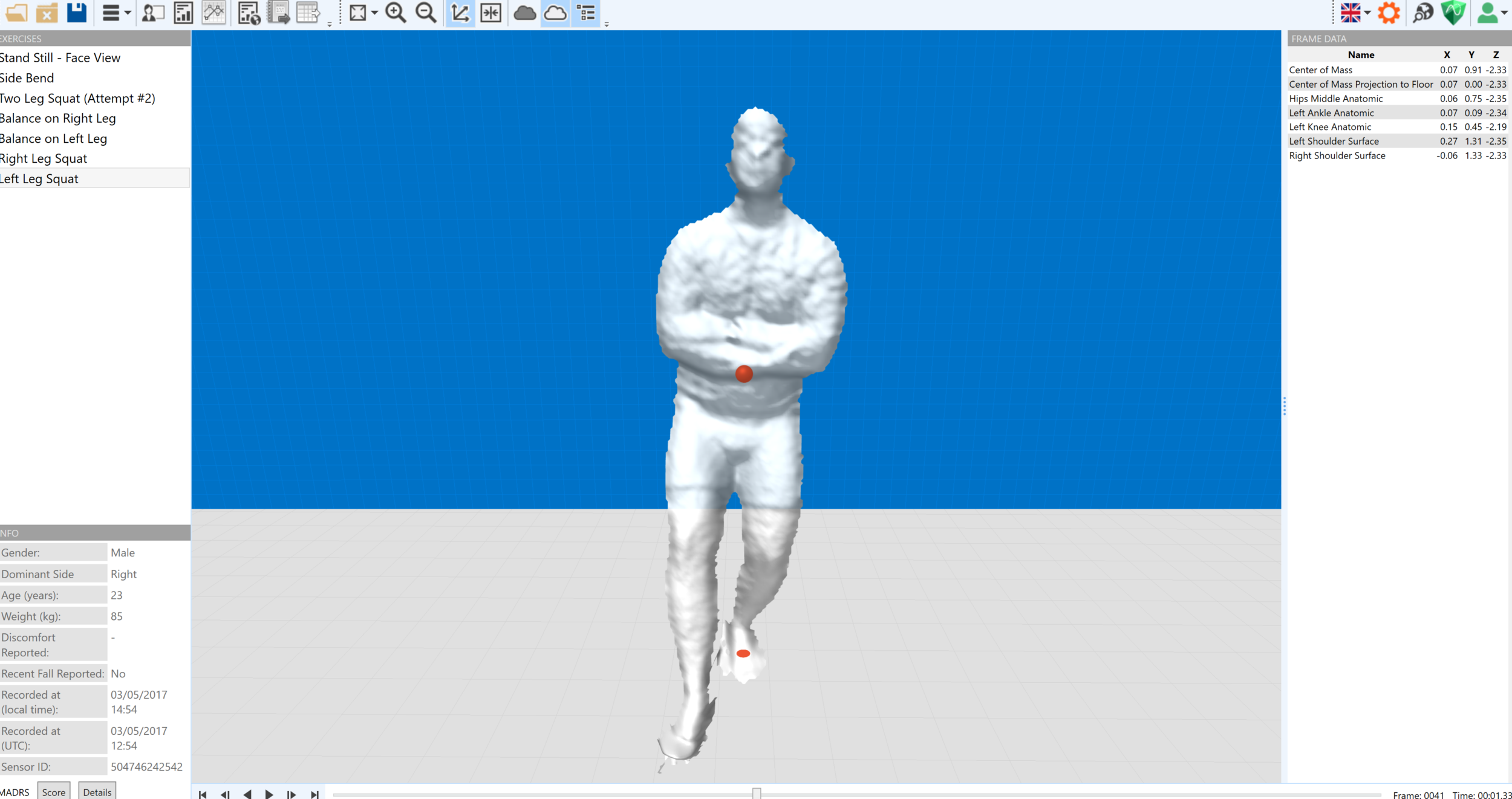 The 3D video allows Providers with an ‘Analyst’ subscription to visualise and analyse the movements of the person during different exercises. The video can be played at various speeds, and the person can be viewed from many different angles.
